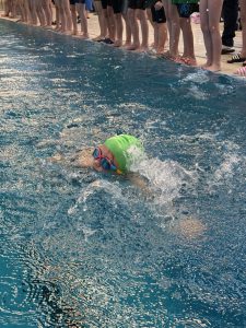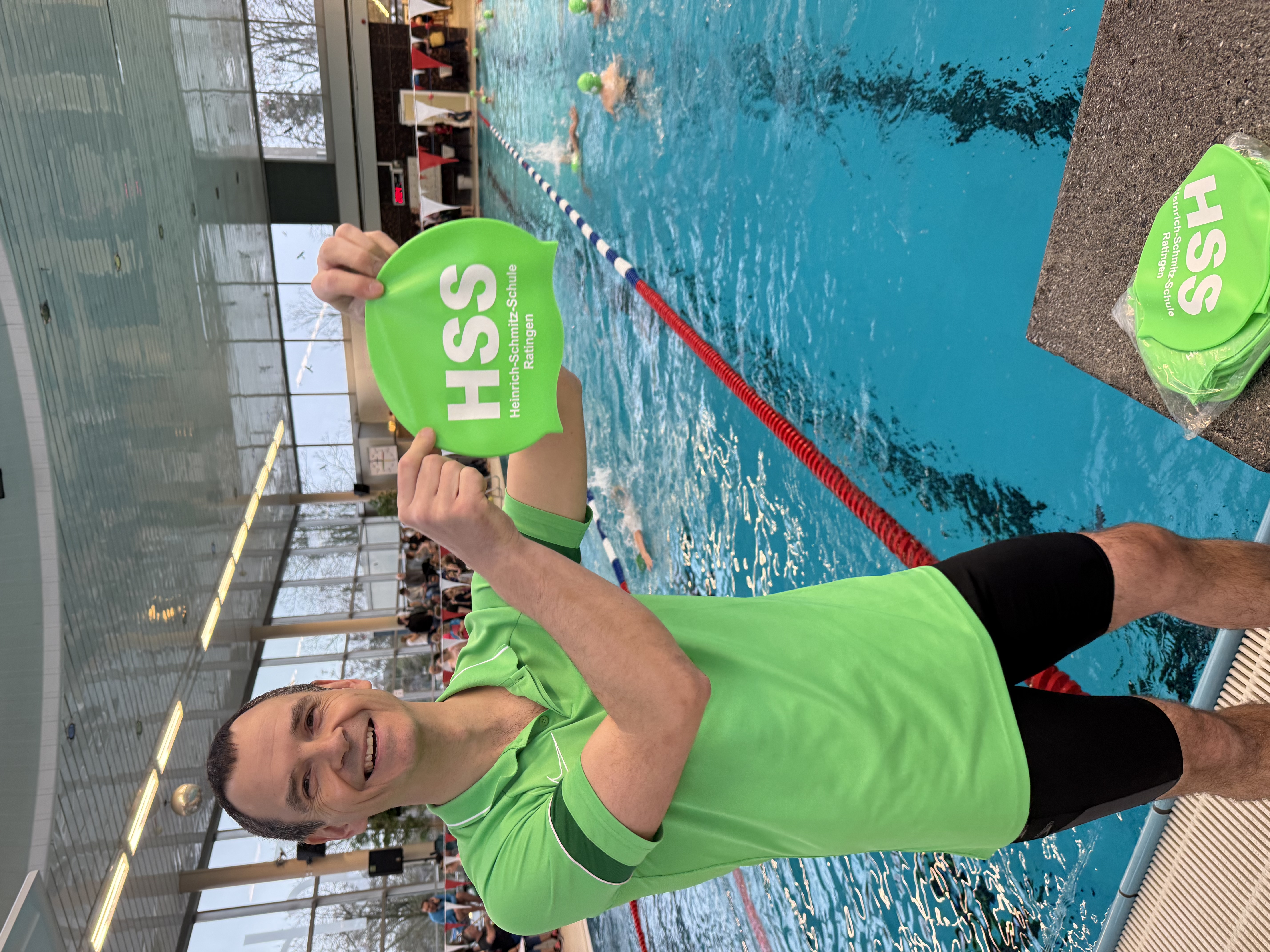 Die grünen beschrifteten Badekappen, die der Förderverein für diesen und die kommenden Schwimmwettkämpfe angeschafft hatte, waren einfach cool und wir noch besser als Team erkennbar. Ein großes Dankeschön an dieser Stelle noch einmal an den Förderverein!