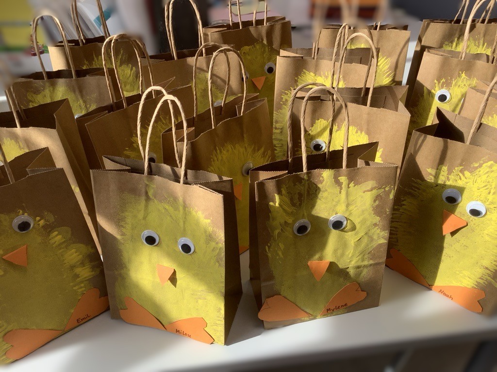 Statt klassischer Körbchen gestalteten die Schüler:innen in diesem Jahr liebevolle Ostertüten, die jeweils mit einem selbstgetupften Küken verziert wurden. Mit Schwamm, Farbpalette und einer Gabel ging es ans Tupfen: Zunächst tupften die Kinder mit gelber Farbe den ovalen Körper des Kükens auf die Tüte. Anschließend formten sie mit der Gabel kleine Akzente, die das Küken besonders flauschig wirken ließen. Um dem Küken noch mehr Ausdruck zu verleihen, wurden Schnabel und Füße aus orangem Papier ausgeschnitten und anschließend gemeinsam mit den Augen aufgeklebt. So erhielt jede Ostertüte ein ganz eigenes, fröhliches Küken.